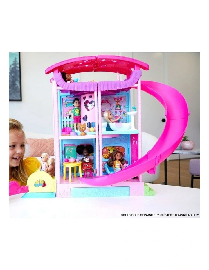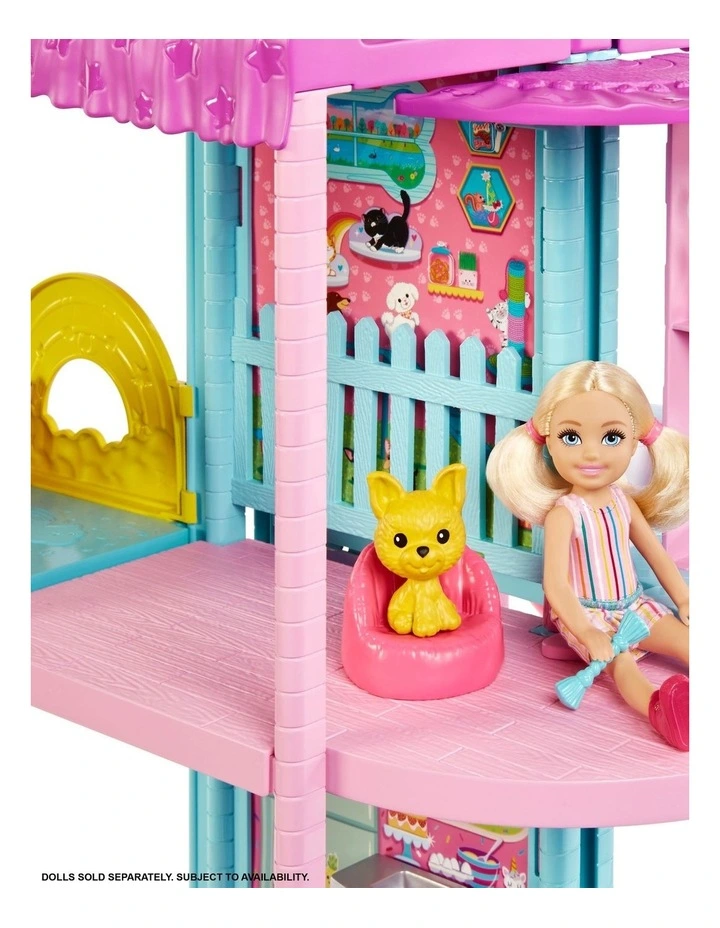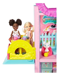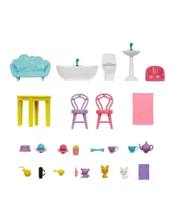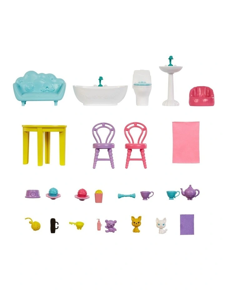 More than 20 storytelling accessories include a pet puppy and kitten, fun furnishings, pet play pieces, tea party accessories and more. With so many pieces and play areas, the storytelling possibilities are endless! Dolls not included. Colours and decorations may vary.