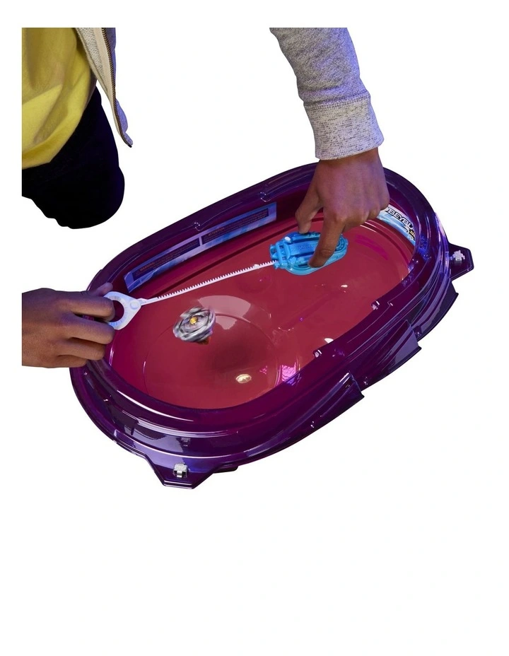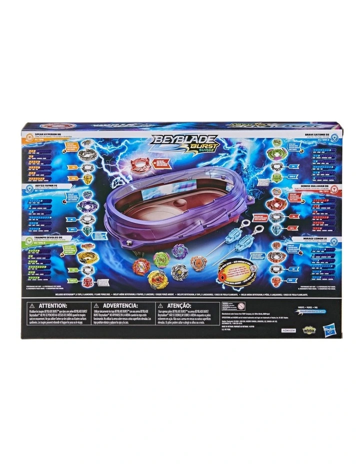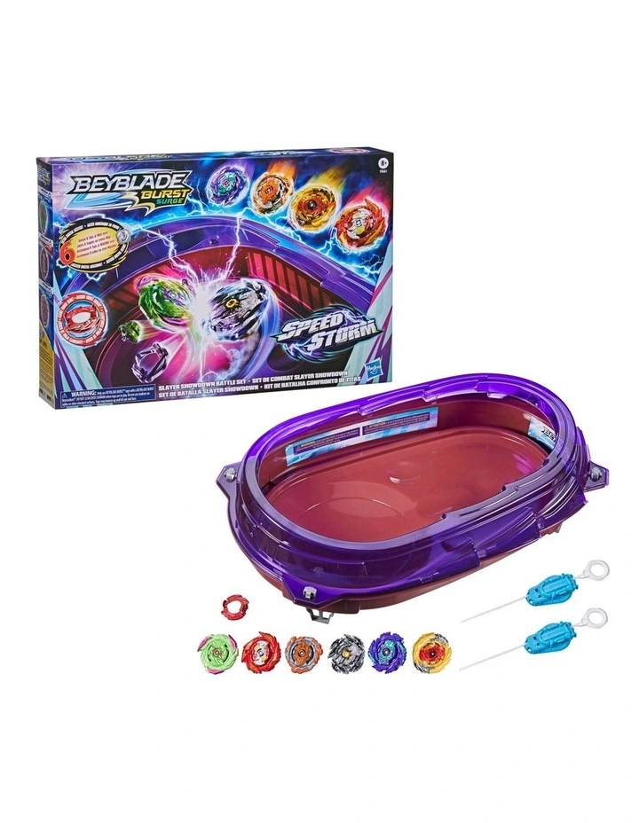 Supercharge the battle strategy with Beyblade Burst Speedstorm tech! Launch into a highspeed head-to-head in the official Beyblade Burst Speedstorm Slayer Showdown Beystadium by Hasbro. At the center of the battle arena is the inescapable Power Vortex — an energy zone designed to pull tops in and give them the ultimate speed boost.Β Includes everything needed to battle: Slayer Showdown Beystadium, 2 right/left-spin launchers, 6 Speedstorm battling tops and a red Flame Forge Disk D54. Harness the power of the storm with Spear Hyperion H6 D14/TSP08 (stamina), Abyss Fafnir F6 D81/TSP11 (attack), Demise Dullahan D6 D84/TSP13 (balance), and Mirage Linor L6 D07/TSP07 (defense), plus Triumph Devolos D6 D50/TSP06-M (defense) and Brave Satomb S6 D16/TSP09-M (attack) with metal parts on their Performance Tips for a heavy metal hit.Β Scan code on Beyblade Burst tops Storm Chips and Slayer Showdown Beystadium to unleash each in the Beyblade Burst app at the max: Level 5. Let it rip!Β Hasbro and all related terms are trademarks of Hasbro, Inc.