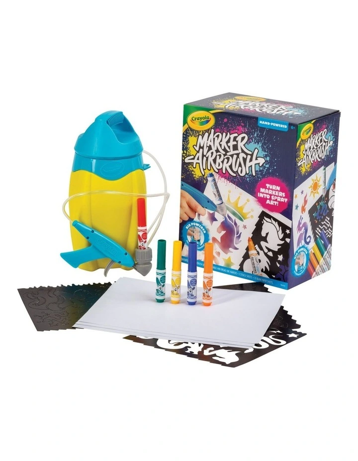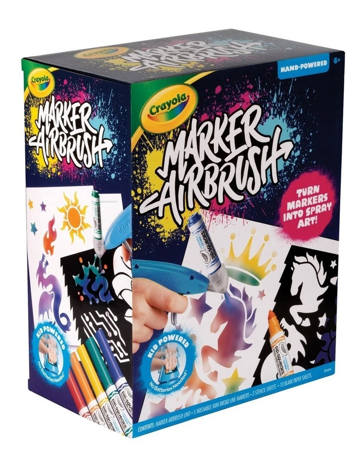 Use Crayola markers in a fun new way with the Marker Airbrush Set. This hand pressurised airbrush machine uses Crayola’s Washable Mini Broad Line Markers to create a fine mist that’s great for all kinds of art projects. Included Stencil Sheets provide guidance so kids can easily produce beautiful and precise airbrush creations on paper and fabrics.