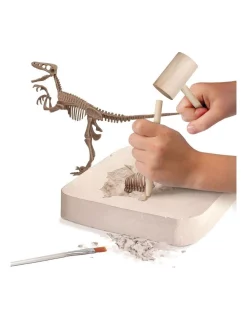 EXCAVATION TOOLS: Chip away at the excavation kits plaster rock to reveal replica bones from a 10-piece Velociraptor skeleton! The provided tool kit has a hammer, chisel & brush.Β