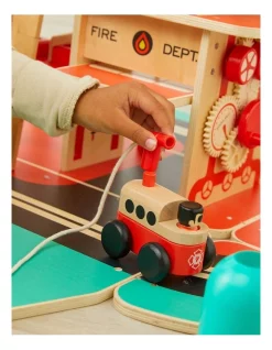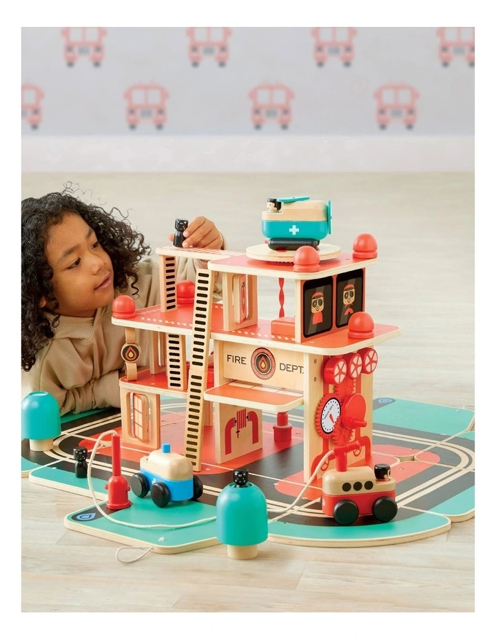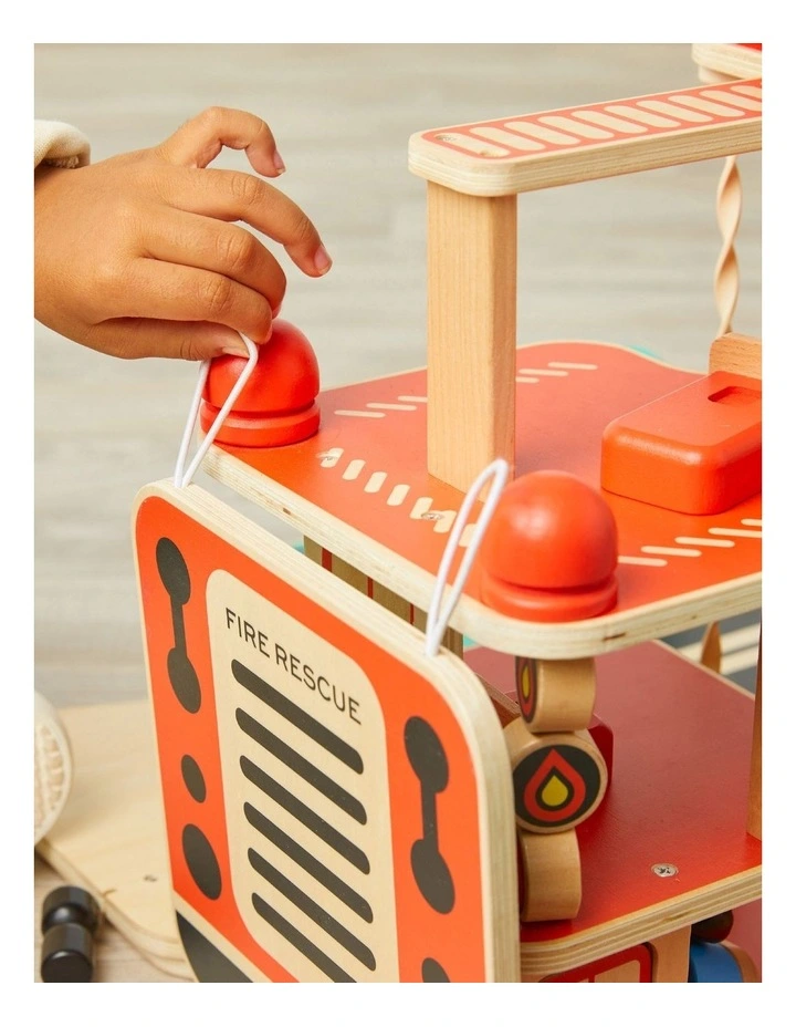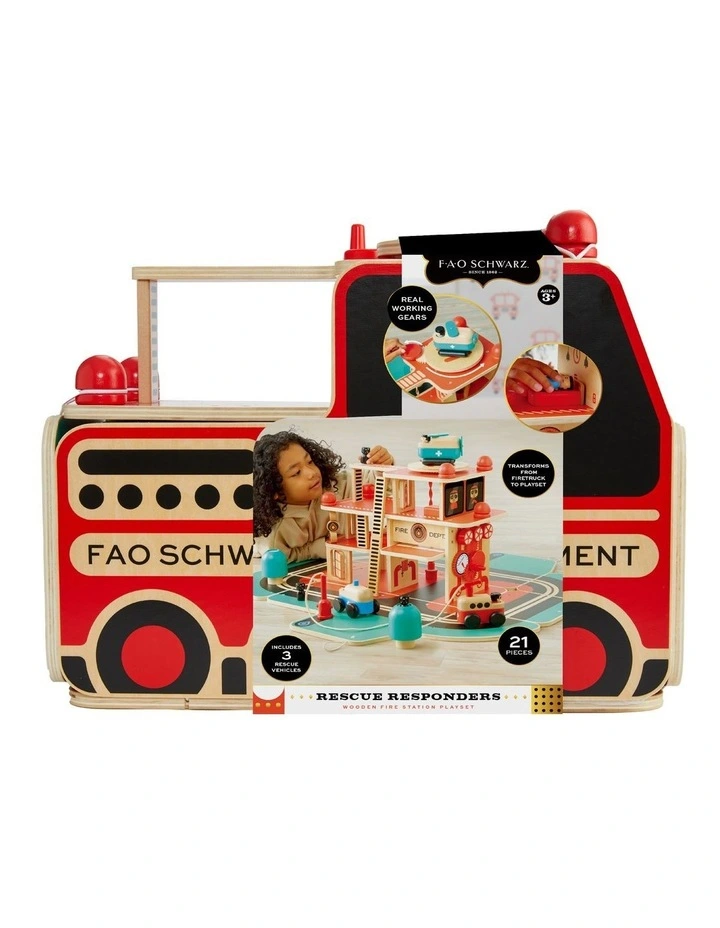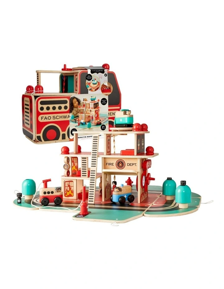 FIRE TRUCK: The FAO Toy Wood Fire Rescue playset starts off as a classic firetruck that magically transforms to reveal the ultimate stage for young front-line heroes.