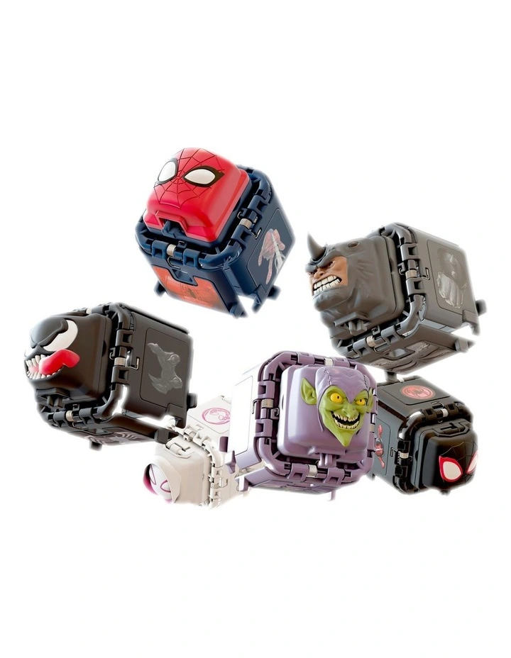 Step 1: Select your secret attack, 2: Set your cube in battle mode, 3: Slide your cube against your opponents! Winner gets the token and the loser gets captured! Tokens are included with each pack- trade them or win by playing. Every token is a puzzle piece. There are 12 rare tokens to collect and 48 tokens to collect and play. The Spider-Man display unit includes 4 assortment packs of Spider-Man vs Venom, Spider-Gwen vs Green Goblin, Miles Morales vs Rhino and Glow Spider-Man vs Octopus. Each pack contains 6 tokens.