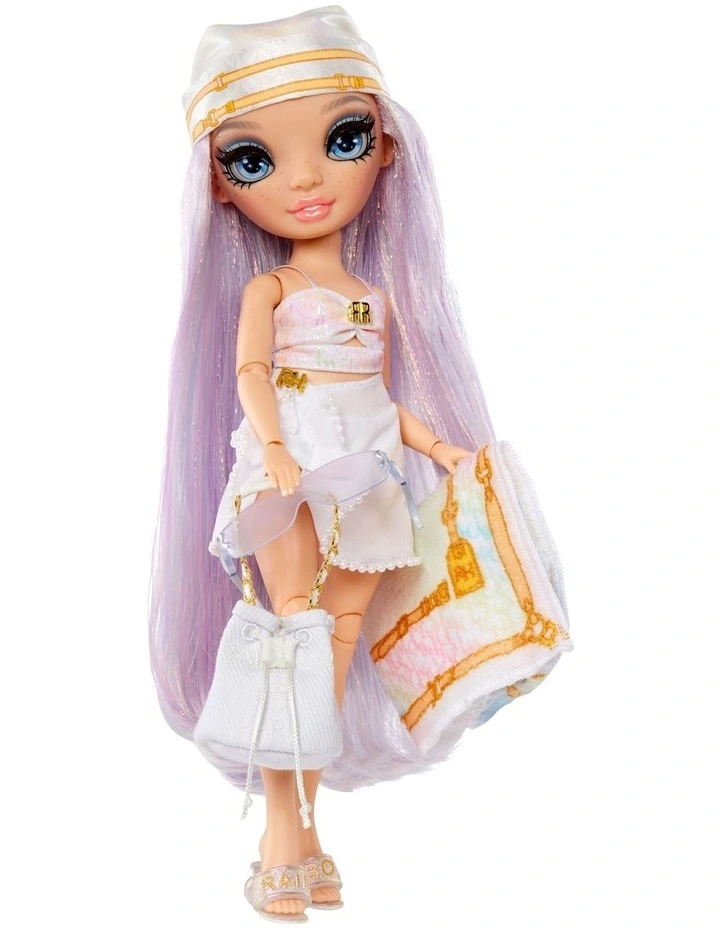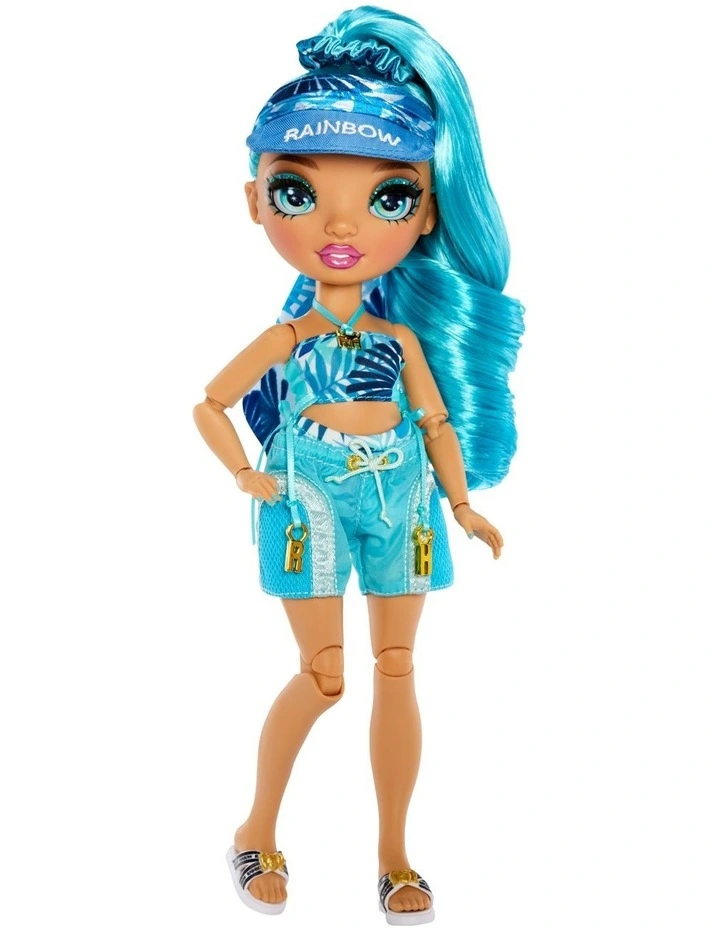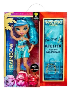 Rainbow High inspires creativity. Meet the students of Pacific Coast High, the most elite fine arts school on the west coast. Here the days are sunny, and the classes are poolside. Each themed playset comes with complete doll outfit, signature must-have poolside accessories, and a bonus feature, interchangeable legs.