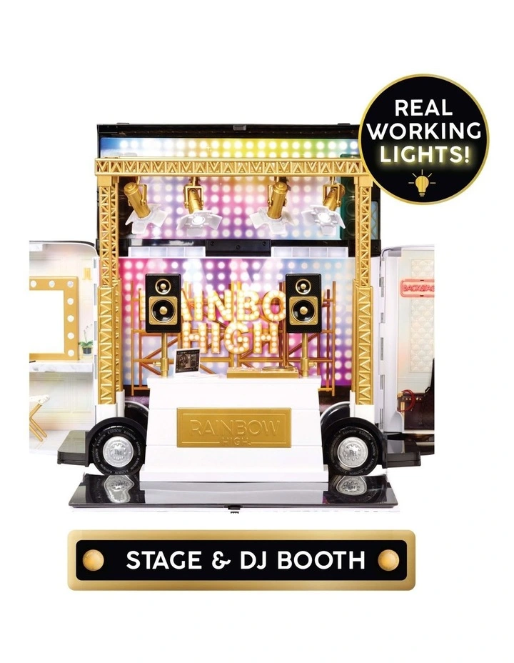 IMAGINATVE PLAY: Bring rivalry between Rainbow High and Shadow High in your version of Rainbow Vision with this premium and modern playset. Your dolls drive the bus in style, perform live under the lights on the stage, host a DJ party with the DJ turn table, get dolled up at the light up vanity stage, or hang backstage. Customize and create with all the amazing pieces which include 14 storytelling pieces.