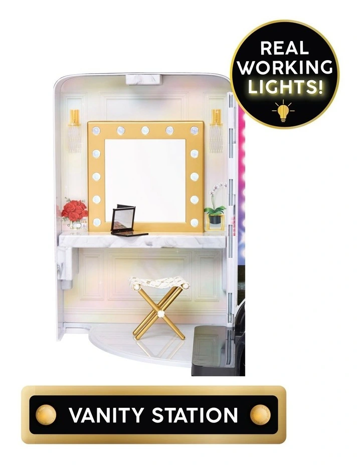 BACKSTAGE- create a backstage moment with the wall decal or open to reveal the driver seat. Fits any Rainbow High or Shadow High Fashion Doll.