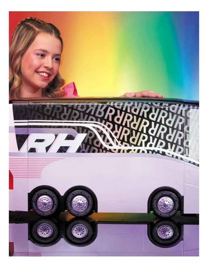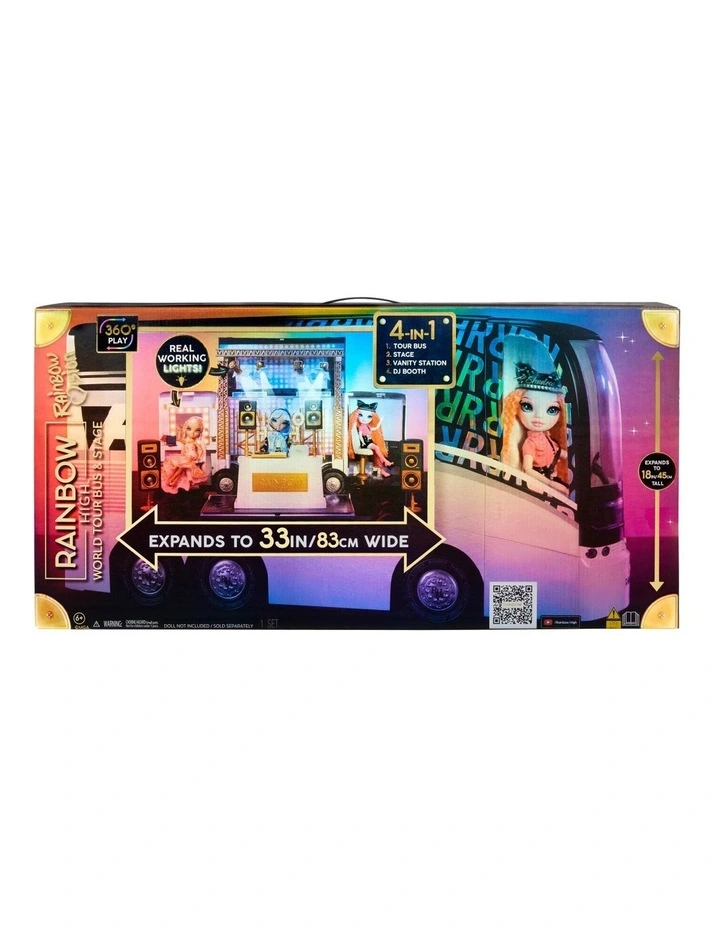Play out the full storyline with the official Rainbow Vision Tour Bus & Stage playset. This playset is perfect to go on tour and set the stage for Rainbow Vision performance. Get the party started at the DJ Booth, set the stage, and glam up together at the vanity station. Dolls sold separately.