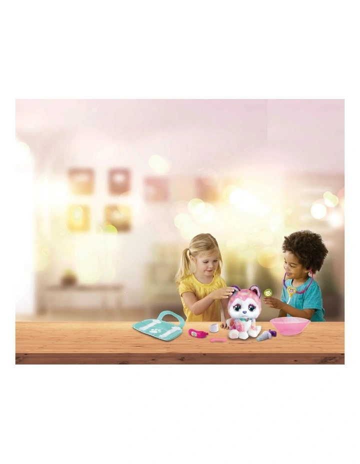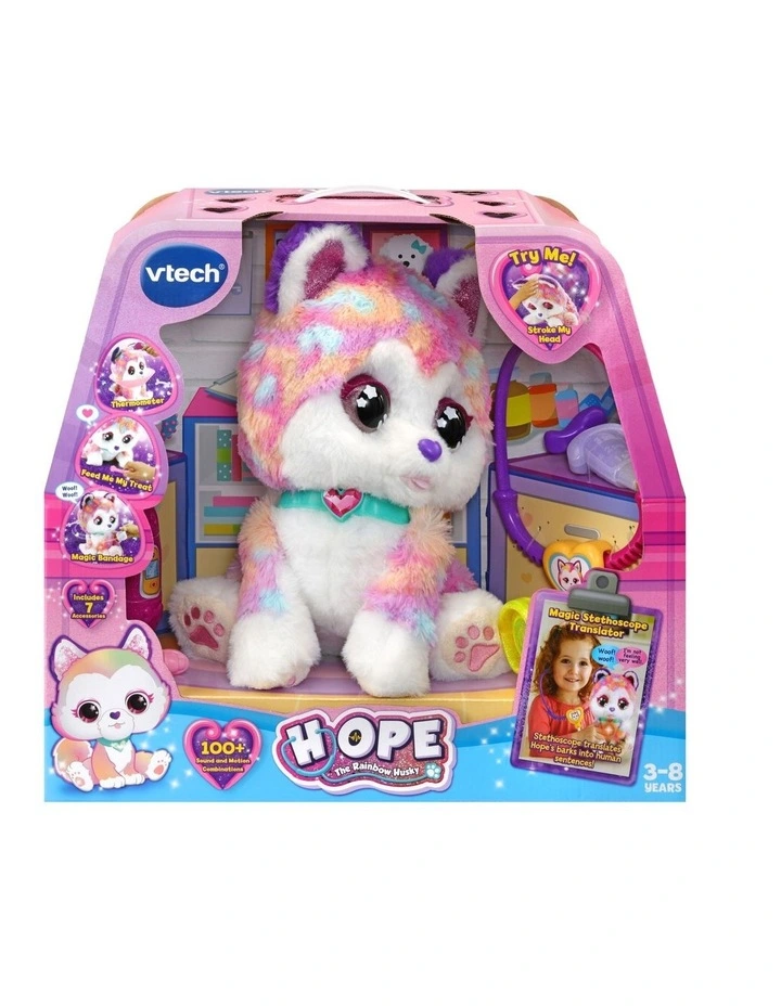 Meet Hope, shes a beautiful Rainbow Husky by VTech and shes hoping to be your best friend! Hope has a lot to say, but her barks will need translating through her magic stethoscope! Just hold it to her chest so you can understand what it is she wants or needs you to do! Hope talks, moves and makes lots of different sounds to show you if shes hungry, has a cold or fever, has hurt her leg or feels itchy.