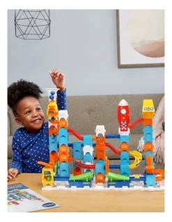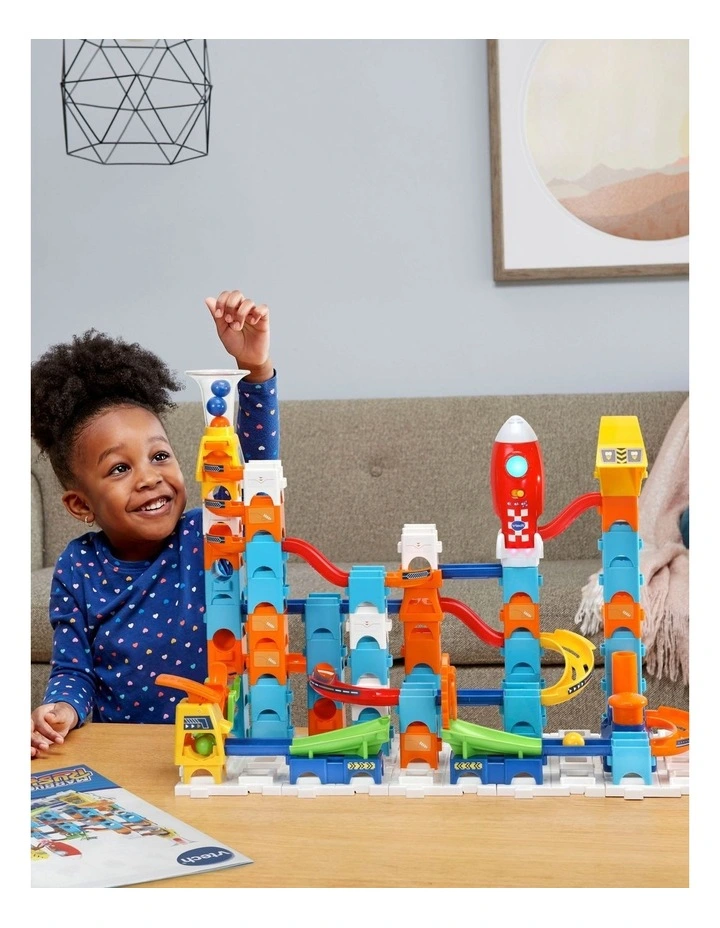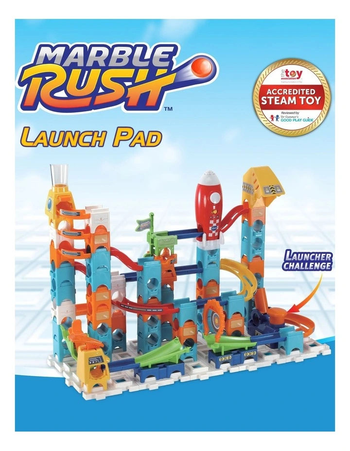 Build thrilling stunts, exciting challenges and watch marbles take off with the Marble Rush Launch Pad Set by VTech.Β Accredited with a STEAM certification by the Toy Association. This 79-piece colour-coded building set includes a musical light-show rocket ship, thrilling ramps, fast tracks, extreme launchers and bases that all easily connect together. The easy-to-follow levelled guide includes three different builds from beginner to advanced, or create your own courses. When construction is complete, drop the marbles into action and watch them race down ramps to the launcher and jump challenges.